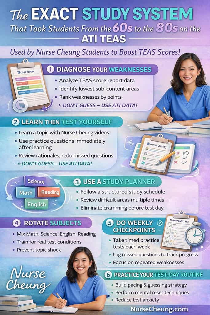 Students who move their scores from the 60s into the 80s aren’t magically smarter. They aren’t lucky test-takers. They simply stop studying randomly and start following a structured, data-driven study system—one designed specifically for how the ATI TEAS actually works.